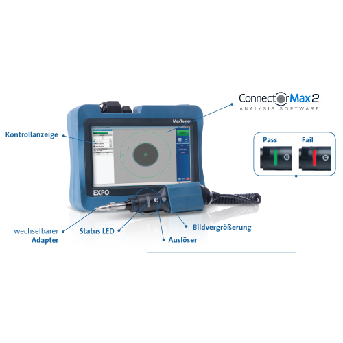 Die intelligenten Faserendflächen-Mikroskope der EXFO FIP-Serie sind die ideale Lösung für schnelle, zuverlässige Steckverbinderprüfungen – unabhängig von der Qualifikation des Technikers. Die kompakte, vollautomatische Glasfaser-Prüflösung ermöglicht eine schnelle und konsistente Ergebnisauswertung für Einfaser- und Mehrfaser-Verbinder. Sie vereinfacht den gesamten Testablauf und gewährleistet eine präzise und schnelle Pass/Fail-Ergebnisbewertung. Dank der leistungsstarken ConnectorMax2 Software werden Faserendflächen automatisch fokussiert, ohne lästiges Anpeilen oder wiederholte Scans. Das Ergebnis liegt sofort vor und kann direkt an der Sonde abgelesen werden: Leuchtet die Kontrollanzeige grün, geht es weiter zum nächsten Stecker. Bei rotem Licht sollte der genaue Beschädigungsgrad am eigenständigen Analysebildschirm MAX-FIP in optimaler digitaler Bildqualität überprüft werden.