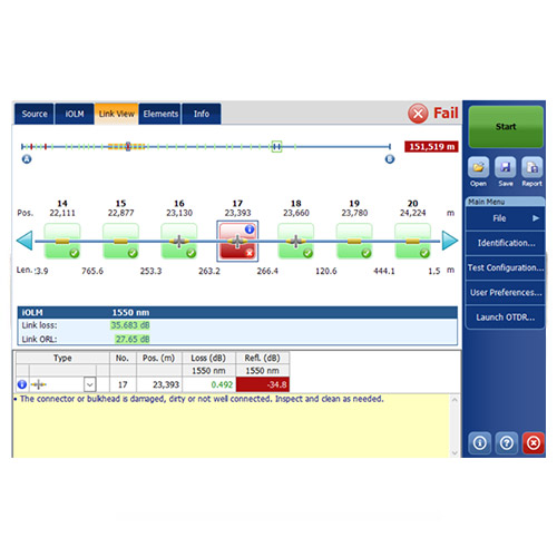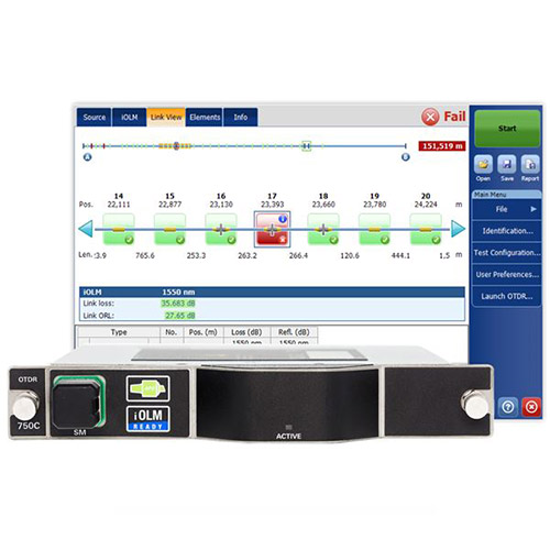 Das FTBx-750C kann mit der OTDR-basierten iOLM-Anwendung betrieben werden. iOLM wandelt die OTDR-Messung in eine vollständig automatisierte, intelligente Analyse um. Die Software führt den Anwender durch alle notwendigen Schritte und liefert sofort verständliche, grafisch aufbereitete Ergebnisse. Fehlerquellen werden minimiert und auch weniger erfahrene Techniker können zuverlässige Messungen durchführen.