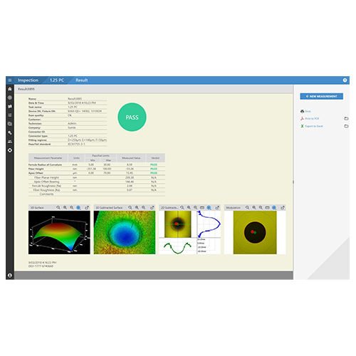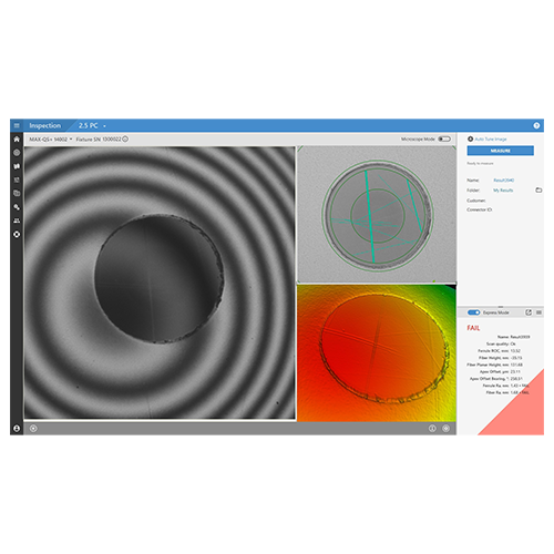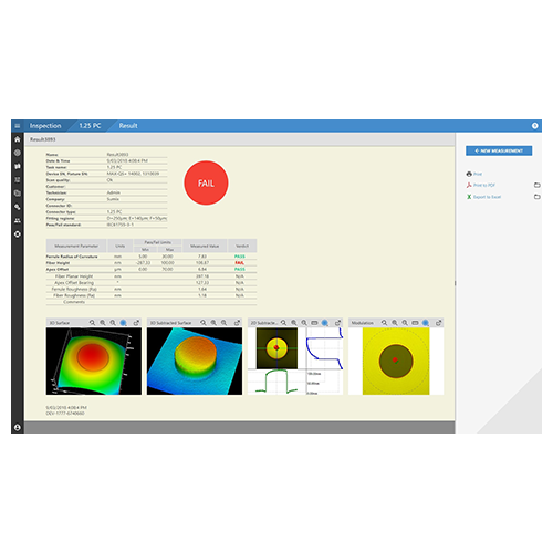 Das Interferometer unterstützt eine Vielzahl gängiger und spezieller Steckverbindertypen, darunter ST, FC, SC, LC, MU, CS®, SN®, MDC, E2000™, MT-RJ, SMA sowie Sondersteckverbinder und gespleißte blanke Fasern. Der Scanbereich für die Faserhöhe beträgt standardmäßig bis zu 100 µm und kann für spezielle Anwendungen softwareseitig erweitert werden. Über die integrierte Datenbankanbindung lassen sich Messergebnisse zentral speichern und einfach in bestehende Fertigungssysteme integrieren. Prüfungen können gemäß IEC, Telcordia