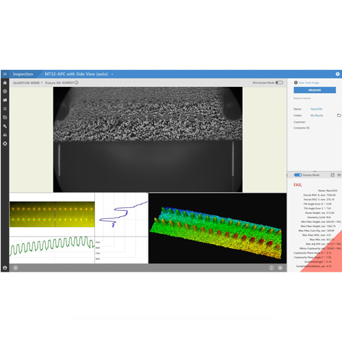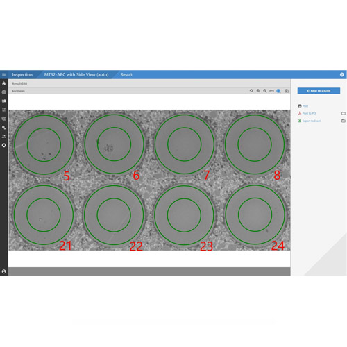 Das System kombiniert Endflächengeometrieanalyse, Anomalieerkennung und Messung der Führungshülsen-Parallelität sowie -winkel in einem einzigen Durchlauf. Die hohe optische Auflösung in Verbindung mit Autofokus und großem Sichtfeld ermöglicht die Prüfung von bis zu 16 Fasern pro Reihe – schnell, zuverlässig und ohne manuelle Nachjustierung.