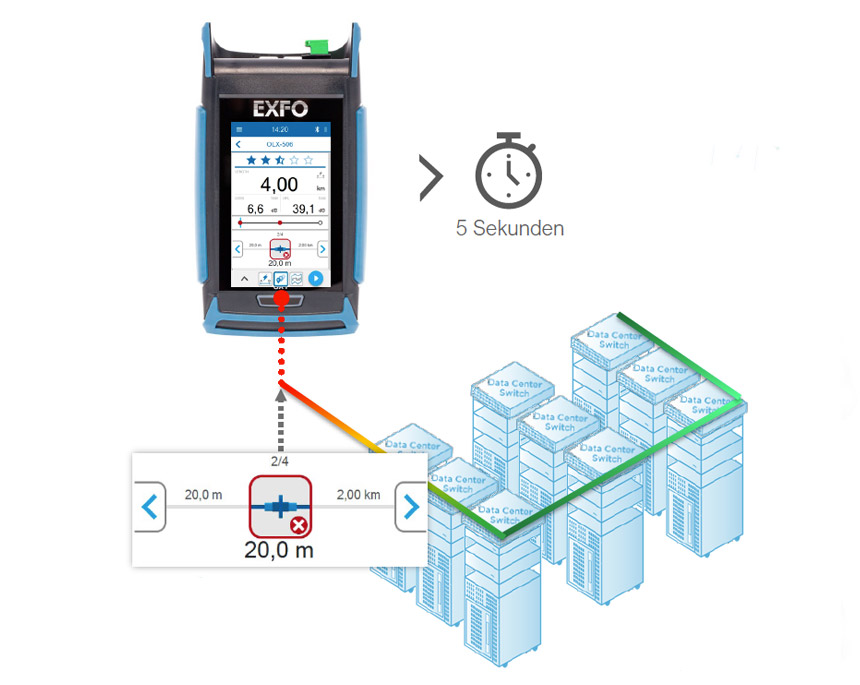 - Der Optical Explorer von EXFO validiert die Link-Qualität in Sekundenschnelle und vergibt eine 1–5-Sterne-Bewertung gemäß den Best Practices der Branche